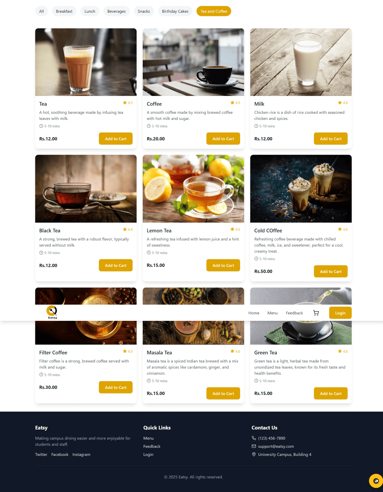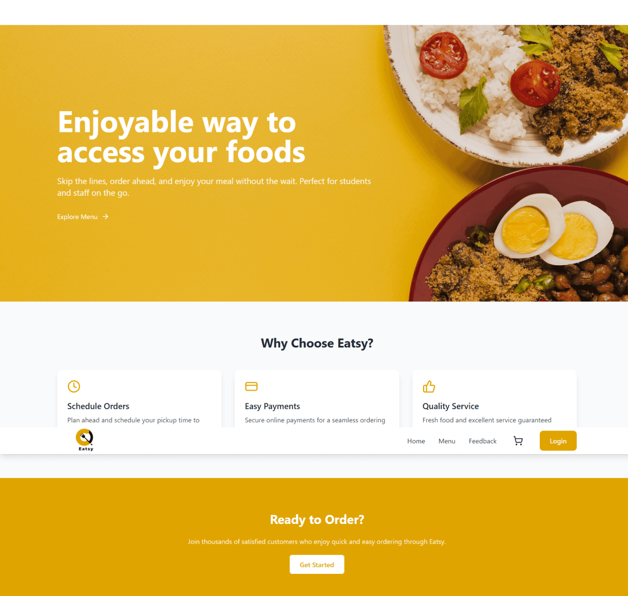 Eatsy is designed with a sleek and user-friendly interface, ensuring seamless food ordering with intuitive navigation. The clean layout and modern aesthetics enhance user experience, making ordering quick and hassle-free.