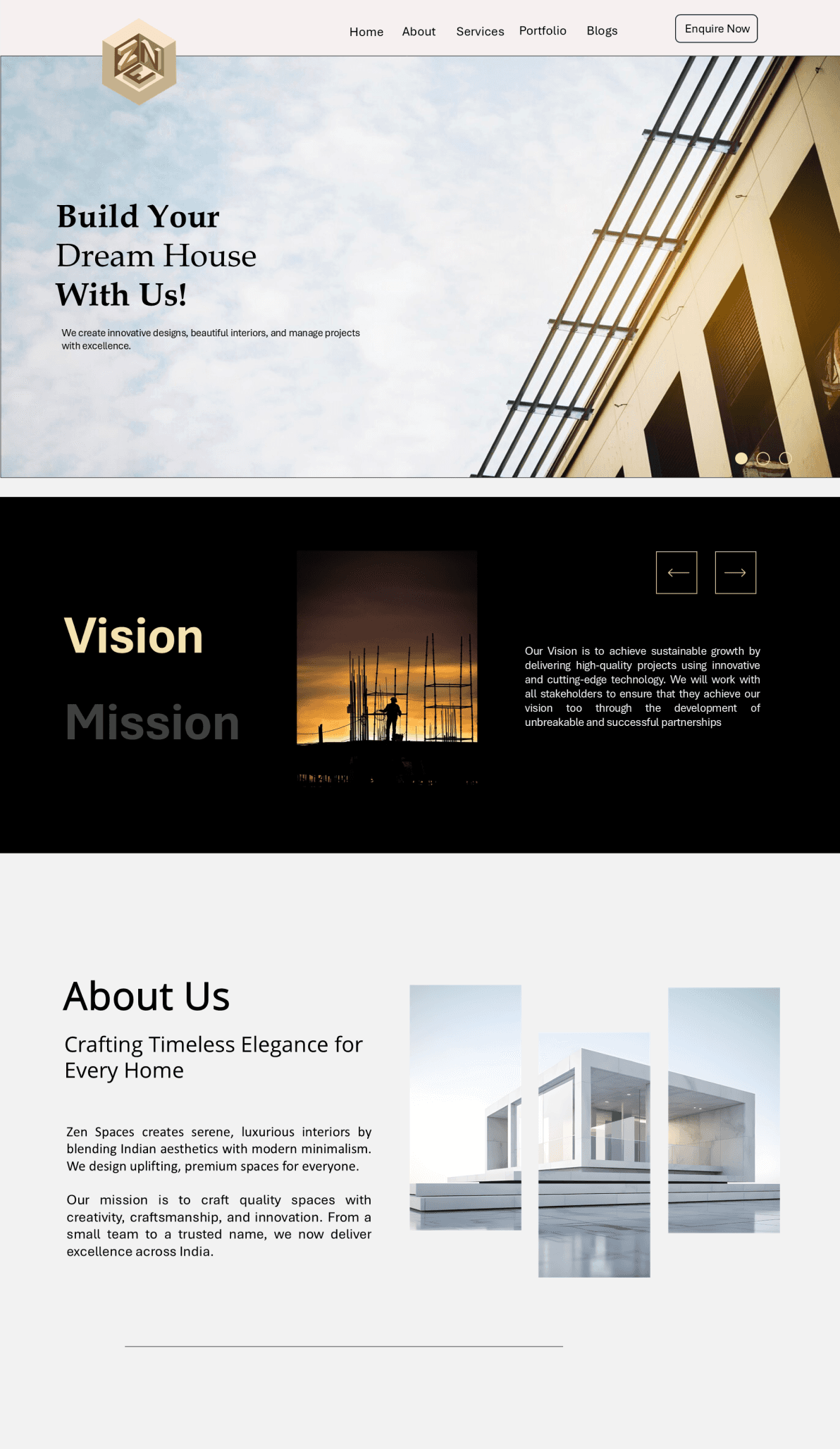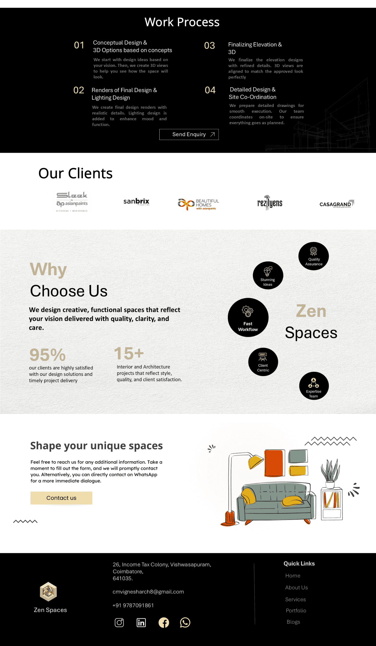 Designed a calm and clean UI for Zen Spaces using PowerPoint, with easy navigation, soft colors, and sections for services, projects, and contact to give a peaceful user experience.